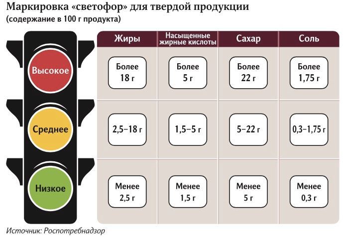 Если, например, в 100 г мясной продукции содержится более 1,75 граммов поваренной соли – покупатель увидит на упаковке графическое изображение красного цвета с указанием количества соли в продукте. Зеленый цвет информирует, что в 100 г продукции – не более 0,3 г поваренной соли. Диапазон между этими значениями – средний уровень содержания соли, на который укажет желтый цвет «светофора».