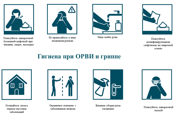 Соблюдение следующих гигиенических правил позволит существенно снизить риск заражения или дальнейшего распространения гриппа, коронавирусной инфекции и других ОРВИ.