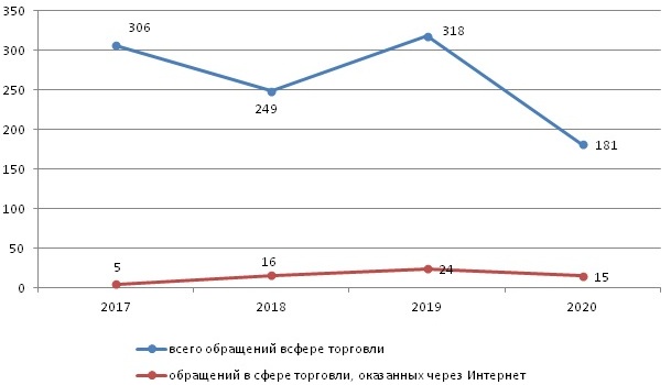 Не смогли урегулировать свои права на уровне предъявления претензии и обратились в Управление с жалобами письменно 400 заявителей, 23% из них – по вопросам нарушений прав потребителей в сфере розничной торговли. При этом несколько снизилось число обращений на нарушение прав потребителей при покупке товаров через Интернет: 09% в 2017г., 3,1% в 2018г., 15% в 2019г., 8,2% в 2020г. - от всех услуг в розничной торговле.