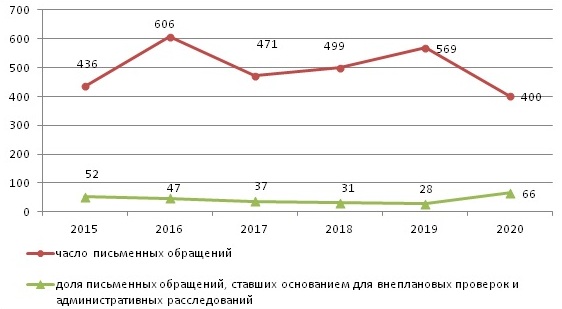 Все принятые письменные обращения граждан рассмотрены в надлежащем порядке: по 502 из них потребителям даны соответствующие консультации и разъяснения; 206 жалоб для рассмотрения направлены по подведомственности (в 2019г. – 129), 6 – явились основанием для проведения проверок (в 2019г. – 73, 2018г. - 67, в 2017г. – 98, в 2016г. -216), 60 – административных расследований (в 2019г. – 90, 2018г. – 80, в 2017г. – 77, в 2016г. – 79). В прошедшем году число внеплановых контрольных мероприятий по обращениям граждан снова снизилось и составило 17% от письменных обращений граждан (в 2019г. – 28%, 2018г. - 31%, в 2017г. - 37%, в 2016г. – 47%, в 2015г. – 52%).