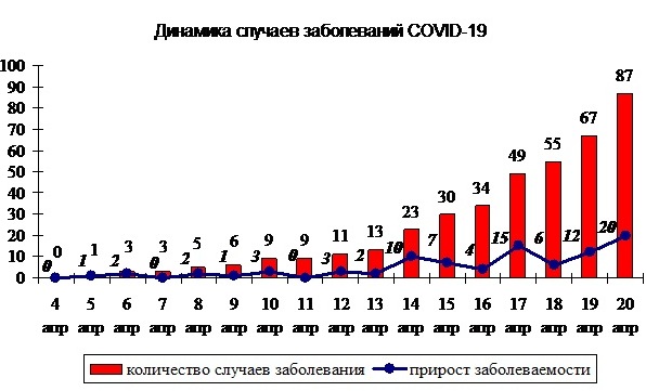 По состоянию на 10:00 20.04.2020 в Карачаево-Черкесии подтверждено 20 новых случаев COVID-19. Всего в КЧР подтверждено 87 случаев заражения новым коронавирусом. В инфекционных стационарах находятся 24 из них с лабораторно подтвержденным диагнозом, два пациента подключены к аппарату ИВЛ. Выздоровел от COVID-19 один человек. Остальные инфицированные новым коронавирусом (63 человека) находятся под медицинским наблюдением на дому, так как они чувствуют себя удовлетворительно и получают необходимое лечение. Случаи заболевания зарегистрированы среди жителей г.Черкесска (51), г.Карачаевска (1), Хабезкого (2), Ногайского (4), Малокарачаевского (8), Зеленчукского (3), Усть-Джегутинского (4), Прикубанского (4), Адыге-Хабльского (4), Абазинского (1) и Урупского районов (5).