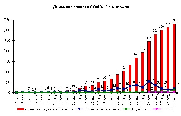 По состоянию на 10:00 29.04.2020 в Карачаево-Черкесии подтверждено 17 новых случаев COVID-19. Выздоровели от COVID-19 14 человек. Всего в КЧР подтверждено 330 случаев заражения новым коронавирусом, в инфекционных стационарах находятся 93 из них с лабораторно подтвержденным диагнозом, три пациента подключены к аппарату ИВЛ. Остальные инфицированные новым коронавирусом (72%) находятся под медицинским наблюдением на дому, так как они чувствуют себя удовлетворительно и получают необходимое лечение.