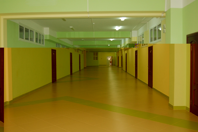 Внутри здания школы на 1-ом этаже предусмотрены большой конференц-зал на 445 мест, спортивный зал, гимнастический зал, гардероб для хранения верхней одежды, медицинский блок, состоящий из 3-х кабинетов, оборудованный в соответствии с санитарно-эпидемиологическими требованиями к организациям, осуществляющим медицинскую деятельность, библиотека и читальный зал на 40 мест, пищеблок, обеденный зал на 306 мест. В обеденном зале оборудованы 20 умывальников. Системы хозяйственно-питьевого холодного и горячего водоснабжения, канализации, вентиляции и отопления оборудованы в соответствии с санитарно-эпидемиологическими требованиями, предъявляемыми к организациям общественного питания. Туалеты для мальчиков и девочек размещены на каждом этаже, оборудованы кабинами с дверями. Для персонала выделены отдельные санузлы.