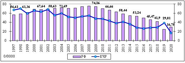 Показатели заболеваемости туберкулёзом на территории КЧР, в сравнении с общероссийскими, за период с 1997г. по 2020г. (0/0000).